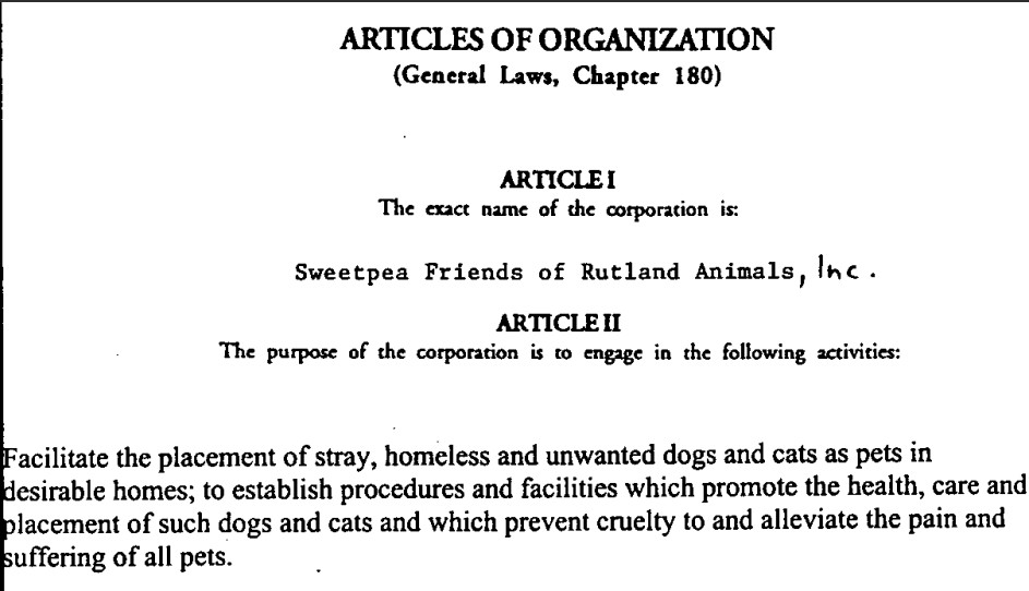 Sweetpea’s mission is to rescue stray, abandoned, or mistreated dogs and cats from Massachusetts, with a focus on Central Massachusetts. We do not import animals from out of state. Part of our mission is to provide education and training to the community in support of the ethical and kind treatment of animals.
